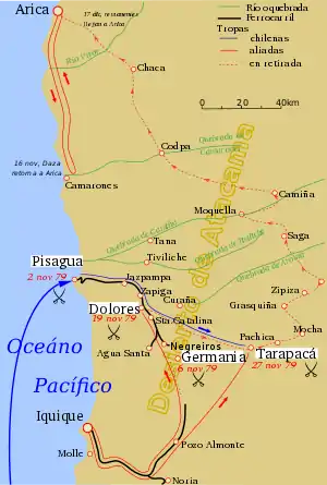 Los territorios disputados, así como las zonas aledañas, se ubican en el desierto de Atacama, y en aquel tiempo tenían acceso expedito solo por mar. En los primeros seis meses, Chile logró la supremacía naval, indispensable para conquistar las zonas costeras del desierto. Antes de fines de 1879 ocupó la provincia peruana de Tarapacá y, a comienzos de 1880, la zona de Tacna y Arica, tras lo cual Bolivia abandonó militarmente la guerra. Luego, en enero de 1881, tras vencer en las batallas de San Juan y Chorrillos y Miraflores al ejército peruano, las fuerzas chilenas ocuparon Lima. Después de estas campañas, la guerra entre Chile y Perú continuó por dos años más entre los remanentes del ejército, guerrillas y montoneros peruanos contra las fuerzas chilenas de ocupación, hasta la firma del Tratado de Ancón en 1883, en la que Perú, entre otras cosas, cedió perpetuamente el departamento de Tarapacá y le fueron retenidas temporalmente las provincias de Arica y Tacna.