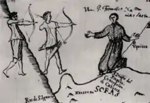 - Sigo aquí la narración como la describe Juan Mateo Mange. Kino refiere que la horda de pimas, primero habló cordialmente con el padre Saeta, y una vez que éste los despedia aquellos cambiaron el semblante y lo flecharon. Pasando a asesinar posteriormente a los sirvientes