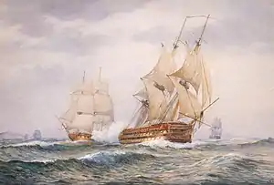 Nelson se unió a la flota de Jervis frente al cabo de San Vicente e informó de los movimientos españoles.[96] Jervis decidió dar batalla y las dos flotas se encontraron el 14 de febrero de 1797. Nelson se encontró en la retaguardia de la línea británica y se dio cuenta de que pasaría mucho tiempo antes de que pudiera poner al Captain en acción.[96] En lugar de permanecer siguiendo la línea, Nelson desobedeció las órdenes y vistió un barco, rompiendo la línea y dirigiéndose para enfrentarse a la vanguardia española, que consistía en el San Josef, de 112 cañones; el San Nicolás, de 80 cañones; y el Santísima Trinidad, de 130 cañones. El capitán enfrentó a los tres, asistido por el HMS Culloden, que había acudido en ayuda de Nelson.[97]