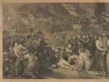 Después de una hora de intercambiar andanadas que dejaron tanto al Captain como al Culloden gravemente dañados, Nelson se encontró junto al San Nicolás. Lideró un grupo de abordaje al otro lado, gritando "¡Abadía de Westminster o gloriosa victoria!" y la obligó a rendirse.[97] el San Josef intentó acudir en ayuda del San Nicolás, pero se enredó con su compatriota y se quedó inmóvil. Nelson condujo a su grupo desde la cubierta del San Nicolás al San Josef y también la capturó. Al caer la noche, la flota española se separó y zarpó hacia Cádiz. Cuatro barcos se habían rendido a los británicos y dos de ellos eran de Nelson.[98]