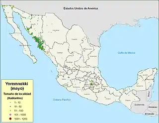 ![]() Distribución geográfica de la lengua Yoremnokki (mayo) en México.