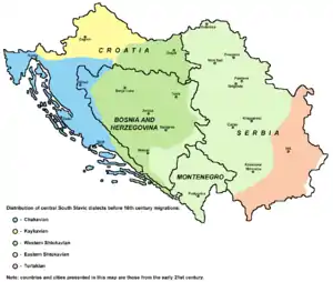 ![]() Distribución de los dialectos serbocroatas antes de las migraciones del siglo XVI. |