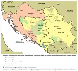 El idioma serbocroata o croatoserbio (srpskohrvatski o hrvatskosrpski) es una lengua eslava meridional, hablada principalmente en Croacia, Serbia, Bosnia y Herzegovina, Montenegro y partes de Kosovo.[1][2] Es una lengua pluricéntrica, compuesta por cuatro variedades literarias (el croata, el bosnio, el serbio y el montenegrino).[3][4][5] La relación entre estas últimas es similar a la similitud entre las variedades formales del español en Latinoamérica y España.[6][7] Se trata de una situación lingüística bastante equiparable, con el añadido de que las diferencias son aún menores entre las cuatro variedades de este idioma.[8][9]
