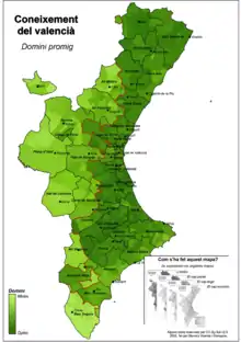 El valenciano (autoglotónimo: valencià)[5] es una lengua romance policéntrica[nota 4] hablada en la Comunidad Valenciana y en la comarca de El Carche en la Región de Murcia; es hablada además bajo el glotónimo catalán en Cataluña, Islas Baleares, Andorra, la Franja de Aragón, el condado de Rosellón y la ciudad sarda de Alguer.[6]