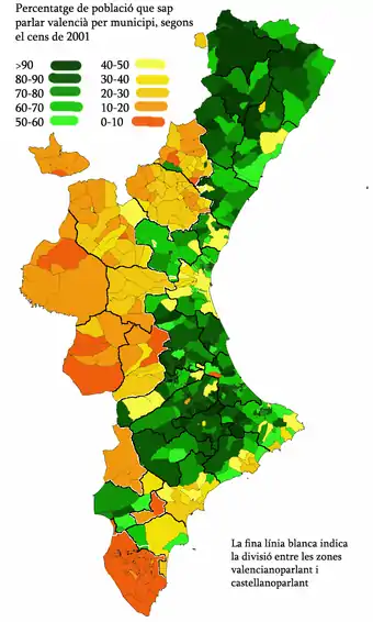 En la Comunidad Valenciana hay declarados oficialmente dos predominios lingüísticos territoriales, el castellano y el valenciano. Esta división toma como unidad el municipio, quedando las áreas definidas por la Ley de uso y enseñanza del valenciano. La zona de predominio lingüístico valenciano son los municipios que, según la Ley de uso y enseñanza del valenciano, son históricamente de lengua valenciana, ubicados geográficamente en el norte, en la costa de la Comunidad Valenciana, y en el área montañosa de la provincia de Alicante, abarcando aproximadamente el 75 % del territorio y en ella reside el 87 % de la población.