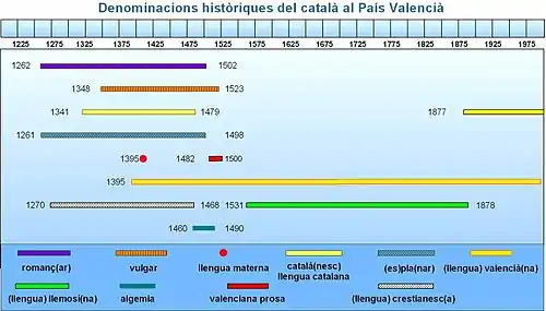 A partir de la segunda mitad del siglo XV, y a consecuencia de la irrupción del siglo de oro valenciano, se generalizó la denominación mayoritaria de “valenciano” o “lengua valenciana” para referirse a la lengua hablada en el Reino de Valencia. Previamente, la lengua había recibido diversas denominaciones como romanç, vulgar o pla. También, durante un amplio período (del siglo XVI al XIX) cobró fuerza la acuñación del término lemosín para referirse al valenciano, en forma de lengua común desprovista de compromisos territoriales.[40]