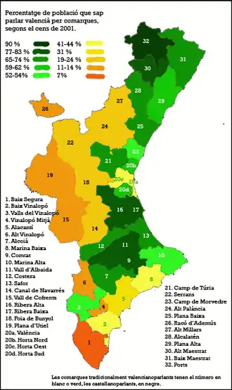 Así, por tanto, su dominio lingüístico abarca históricamente las comarcas litorales, el llano central y las áreas montañosas del sur. Hoy en día, en las grandes capitales históricamente valencianohablantes (y en cualquier parte del territorio, si bien de forma no tan acusada), la presencia del valenciano está en decadencia, a causa del proceso de minorización de esta lengua en favor del castellano. No obstante, en términos generales, ha experimentado una notable recuperación, ya que ha pasado del 4 % de valencianos alfabetizados en 1982 al 85 % en 2001.