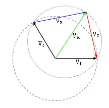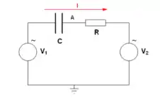 En el circuito de la derecha, un condensador de y una resistencia de en serie, están conectados entre dos generadores sinusoidales. Tomamos como generadores dos fases del suministro trifásico. El generador de izquierda será nuestro generador de referencia . El generador de derecha está en avance de fase de . Es decir, . Con el formalismo de impedancias, el generador de izquierda será y el de derecha . Comencemos calculando la diferencia de tensión entre los dos generadores: