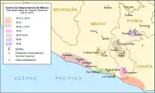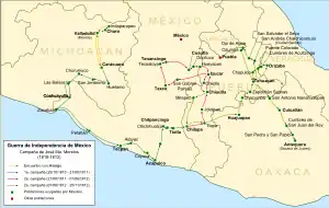 En la región de Tierra Caliente, desde finales de septiembre de 1810 existieron brotes de rebeliones. Los líderes más notables fueron Ávila y Ruvalcaba, pero estos fueron vencidos por José Acha, quien era administrador de las haciendas de Gabriel de Yermo. Ruvalcaba murió en los encuentros, el virrey designó a José Antonio Andrade y poco después a Nicolás Cosío para defender la zona contra nuevos levantamientos.[130] En octubre de 1810 —después de haberse entrevistado con Hidalgo en el pueblo de Charo— José María Morelos inició su campaña en Carácuaro con solo veinticinco hombres. Fue incrementando paulatinamente su ejército, pero la estrategia militar de Morelos fue diferente a la de Hidalgo: su ejército nunca superó más de seis mil hombres, los cuales eran disciplinados y tenían armamento adecuado. Después de avanzar por Petatlán, a su campaña se unieron Juan José, Pablo y Hermenegildo Galeana en Técpan. Su marcha continuó por Atoyac y Coyuca llegando al puerto de Acapulco, lugar que infructuosamente intentó tomar por asalto a finales de 1810.[131] Poco después, Calixto, Leonardo, Máximo, Miguel, Víctor y Nicolás Bravo se le unieron en Chichihualco, así como Vicente Guerrero durante la Batalla de El Veladero.[132] En enero de 1811 derrotaron al capitán español Juan Francisco París en la Batalla de Tres Palos.