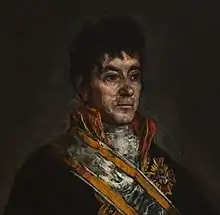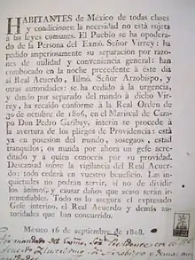 La noticia del Motín de Aranjuez (18 y 19 de marzo) llegó a Ciudad de México el 8 de junio de 1808.[26][27] El virrey José de Iturrigaray, elegido por intervención del primer ministro Manuel Godoy, se mostró consternado por los sucesos[n. 9] y por el apoyo de los españoles peninsulares residentes en Nueva España al partido fernandista.[n. 10] No obstante, ordenó los preparativos para realizar la jura y proclamación de Fernando VII como soberano de España e Indias. El 23 de junio los novohispanos tuvieron conocimiento del levantamiento del 2 de mayo en la metrópoli y, vía la Gaceta de Madrid, el 14 de julio estuvieron al tanto de las abdicaciones de Bayona y el nombramiento de Joachim Murat como lugarteniente general del reino.[28] [29] El virrey se reunió con los miembros de la Real Audiencia y acordaron guardar secreto de sus preocupaciones y cabildeos, en cambio dieron a conocer la abdicación de Fernando VII a través de La Gaceta de México el 16 de julio.