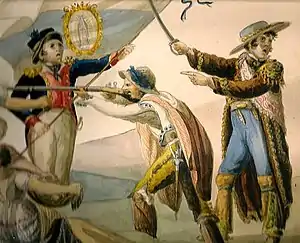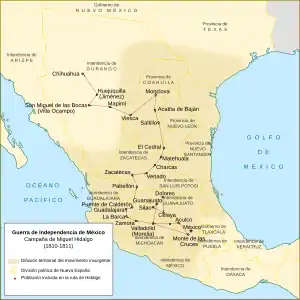 El movimiento independentista iniciado en Dolores el 15 de septiembre de 1810 fue secundado en otras partes de Nueva España. A principios de noviembre de 1810, José Antonio Torres logró imponerse sobre la poca resistencia que ofrecieron las fuerzas virreinales en La Barca y en la Batalla de Zacoalco.[108] Con una fuerza de veinte mil hombres entró a la ciudad de Guadalajara el 11 de noviembre.[109] Casi de inmediato José María Mercado fue comisionado para tomar las plazas de Tepic y San Blas, objetivos que logró sin disparar un solo tiro el 28 de noviembre y el 1 de diciembre respectivamente. Para diciembre de 1810 se había fortalecido en una parte importante de Nueva Galicia[110] [111]