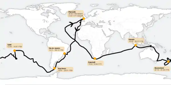En 1768 Cook zarpó al mando del HMB Endeavour desde Inglaterra, navegó el Atlántico Sur, dobló el cabo de Hornos y continuó hacia el oeste por el Pacífico, hasta llegar a Tahití el 13 de abril de 1769, en donde se debían llevar a cabo las observaciones. El tránsito de Venus estaba pronosticado para el 3 de junio de ese año, por lo que hasta ese momento se encargó de la construcción de un pequeño fuerte y observatorio.