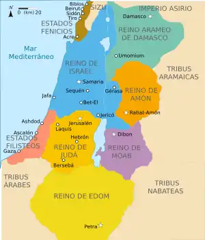 El Reino Unido de Israel nunca existió y Judá, un distrito rural,[23] solamente emergió como estado a partir del siglo IX a. C. y bajo el control del Reino de Israel con capital en Samaria. Sin embargo, cuando este estado fue conquistado por el imperio neoasirio en 720 a. C. Judá permaneció independiente, pero como vasallo de Asiria. Esto favoreció un crecimiento de la población, incrementada con emigrados del norte, y el desarrollo económico del reino.[24] A partir de finales del siglo VII a. C., Judá entró en la esfera de influencia de Babilonia y quedó envuelta en las luchas entre esta y los egipcios, como resultado de las cuales cayó en 587 a. C. La ciudad de Jerusalén fue destruida y parte de los pobladores del reino, en especial la aristocracia, es llevada cautiva a Babilonia.[25]