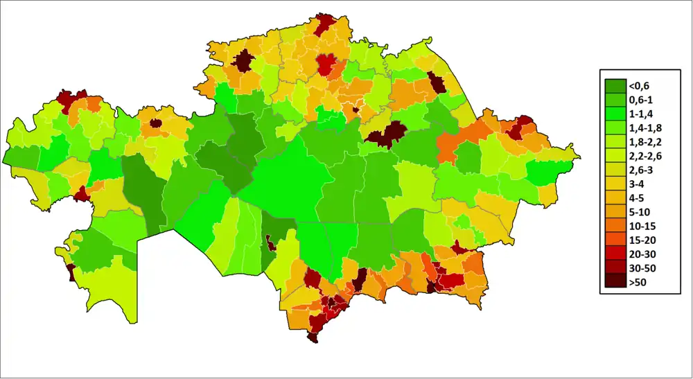 | Oskemen | 283 226 | 1 396 593 | 4,9 | |||