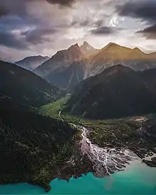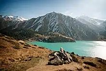 Desde el este, la Depresión del Caspio limita con las estribaciones meridionales de los montes Urales, los montes Mugodzhar, que se elevan hasta los 656 metros.[38] Más al sureste, alrededor del mar de Aral, se encuentra la Depresión de Turania, que también incluye los mayores desiertos del país, el Kysylkum y el Aralkum. En el centro de Kazajistán se encuentra el Umbral de Kazajistán (Saryarka en kazajo), una zona caracterizada por estepas y semidesiertos con muchas montañas y cordilleras de tamaño medio (entre 500 y 1547 m) como el Ulutau, el Kökschetau o el Karkaraly. En el noroeste, el Umbral Kazajo limita con la meseta de Turgai y en el norte con la llanura de Siberia Occidental. En estas regiones, el paisaje se caracteriza por estepas fértiles y estepas forestales con muchos lagos y ríos. Al este de la república se encuentran las cordilleras cubiertas de bosques del Altái, con la montaña más alta de la región, Belucha (4506 metros), que separa Siberia de los desiertos de Asia Central.