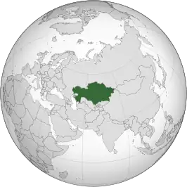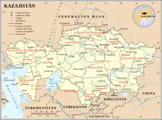 escuchar); en ruso: Казахстан Kazajstán , cuyo nombre oficial es República de Kazajistán,[9](en en kazajo: Қазақстан Республикасы Qazaqstan Respýblıkasy; en ruso: Респу́блика Казахста́н Respúblika Kazajstán)[10] es un país transcontinental, con la mayor parte de su territorio situado en Asia Central y una menor (al oeste del río Ural) en Europa Oriental. Con una superficie de 2 724 900 km²,[3] es el noveno país más grande del mundo, así como el Estado sin litoral marítimo más extenso del mundo (considerando el mar Caspio como un lago). Kazajistán es uno de los seis Estados túrquicos independientes junto a Azerbaiyán, Turquía, Kirguistán, Turkmenistán y Uzbekistán; comparte fronteras con los tres últimos y con Rusia y China, a la vez que posee costas en el mar Caspio y el mar de Aral. La capital fue trasladada en 1997 de Almatý, la ciudad más poblada del país, a Astaná. Kazajistán pertenece a la región natural denominada Asia Central, formada además, junto con Tayikistán, por tres de los países ya citados, Kirguistán, Uzbekistán y Turkmenistán.