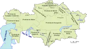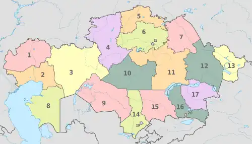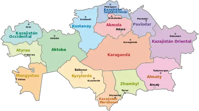 Kazajistán está formado por 14 provincias (oblystar; en singular: oblys). A su vez los oblystar se dividen en municipios (аудандар "Audandar") y tres ciudades (qala; en singular: qalasy):