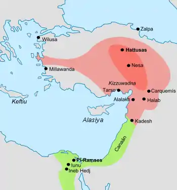 En el siglo XIII a. C., todas estos imperios se derrumbaron repentinamente, todas las ciudades del este mediterráneo fueron saqueadas en el lapso de pocas décadas. Desaparecieron los reinos aqueos, y el imperio hitita fue destruido. Egipto consiguió expulsar a sus invasores con un gran esfuerzo, tras lo que su territorio se redujo durante más de un siglo y la autoridad real se debilitó permanentemente. Solamente Asiria escapó sin daño significativo.[13]