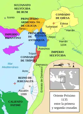 Llegó hasta Jerusalén, en medio de matanzas indiscriminadas.[25] Los cruzados fundaron el Reino de Jerusalén (dirigido inicialmente por Godofredo de Bouillón, el principado de Antioquía y los condados de Edesa (actual Urfa, en Turquía) y Trípoli (en el actual Líbano).