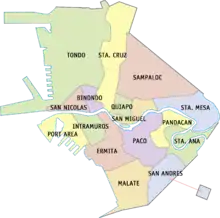 La ciudad se divide en seis distritos legislativos y consiste en dieciséis distritos geográficos: Binondo, Ermita, Intramuros, Malate, Paco, Pandacán, Port Area, Quiapo, Sampaloc, San Andrés, San Miguel, San Nicolás, Santa Ana, Santa Cruz, Santa Mesa y Tondo. El comercio más activo y algunos de los lugares más históricos y emblemáticos de gran importancia cultural en el país, como la sede del Ejecutivo filipino y la Suprema Corte de las Filipinas, se encuentran en esta ciudad. Manila es sede de varias instituciones científicas y educativas, numerosas instalaciones deportivas, así como de un amplio elenco de entidades culturales del país y otros lugares cultural e históricamente significativos.