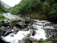Un río es un curso de agua natural,[11] generalmente de agua dulce, que fluye hacia un océano, un lago, un mar u otro río. Unos pocos ríos simplemente fluyen hacia el suelo y se secan completamente antes de llegar a otro cuerpo de agua.