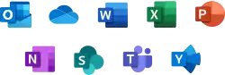 ![]() Desde la esquina superior izquierda: Outlook, OneDrive, Word, Excel, PowerPoint, OneNote, SharePoint, Teams, y Yammer. | ||