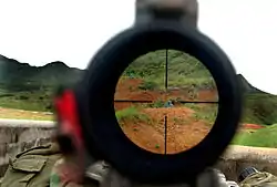 6. Retícula: Dibujo, generalmente una "cruz", que hace de referencia angular y rudimentariamente provee información sobre el tamaño y la posición (relativa al observador) del objetivo. Las más sofisticadas, cuentan además con otras marcas, en este caso llamada "retícula escaladas", proveyendo así información con mayor precisión.[4]