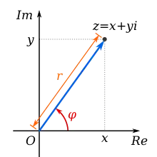 Si el complejo está escrito en forma exponencial z = r eiφ, entonces |z| = r. Se puede expresar en forma trigonométrica como z = r (cosφ + isenφ), donde cosφ + isenφ = eiφ es la conocida fórmula de Euler.