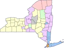 Nueva York está dividido en 62 condados, que incluyen los cinco condados que componen la ciudad de Nueva York. A excepción de estos últimos, todos los condados del estado son administrados a través de consejos de supervisores elegidos por la población de sus respectivos condados. El término de oficio de estos oficiales varía de condado en condado. La responsabilidad de estos condados es administrar las cortes judiciales regionales, realizar el mantenimiento de carreteras y autopistas, administrar los presupuestos del gobierno del estado para programas de asistencia social y económica, y administrar, en ciudades menores, infraestructuras tales como parques, facultades, distritos escolares y sistemas de saneamiento básico. Estas responsabilidades no existen en los cinco condados de la ciudad de Nueva York.