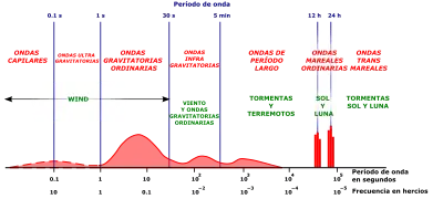 Clasificación de las olas en función del su período. Las olas podrían clasificarse desde las olas ordinarias que genera el viento hasta la mareales, con períodos de horas.