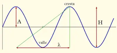 La parte más alta de una ola es su cresta, y la parte más profunda de la depresión entre dos olas consecutivas se llama valle. A la distancia entre dos crestas se le denomina longitud de onda (λ) y a la diferencia de altura entre una cresta y un valle se le llama altura (H) de la ola. La amplitud es la distancia que la partícula se aparta de su posición media en una dirección perpendicular a la de la propagación. La amplitud (A) vale la mitad de la altura. La pendiente (δ) es la inversa de la tangente entre la altura y la longitud de onda.