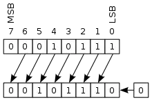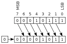 En números enteros sin signo, el desplazamiento lógico hacia la izquierda equivale a una multiplicación por 2 y el desplazamiento lógico hacia la derecha equivale a una división por 2. En la división (desplazamiento hacia la derecha), se pierde el bit menos significativo, dando como resultado un truncamiento del resultado (redondeo hacia abajo, hacia menos infinito). Así, 6 / 2 es igual a 3, pero 7 / 2 es igual a 3,5, pero el 0,5 se pierde quedando el resultado en 3.