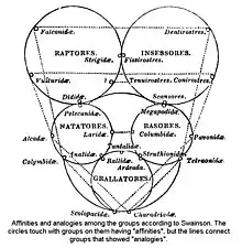 Los coleccionistas de aves de la era victoriana observaron las variaciones en las formas de las aves y sus hábitos a lo largo de las regiones, notaron la especialización local y la variación en especies de amplia distribución. Las colecciones de museos y los coleccionistas privados crecieron con contribuciones de varias partes del mundo. La denominación de especies con el sistema binominal y la organización de aves en grupos basados en sus similitudes se volvió el trabajo principal de los especialistas de museos. Las variaciones en las aves de amplia distribución a lo largo de regiones geográficas causó la introducción de denominaciones trinominales. La búsqueda de patrones en las variaciones de las aves fue intentada por muchos. Los primeros ornitólogos como William Swainson siguieron el sistema quinario y este fue remplazado por «mapas» más complejos de afinidades en trabajos por Hugh Edwin Strickland y Alfred Russel Wallace[30] Se cree que los pinzones de las Galápagos fueron de una influencia especial en el desarrollo de la teoría de la evolución de Charles Darwin. Su contemporáneo Alfred Russel Wallace también notó estas variaciones y las separaciones geográficas entre las diferentes formas que dieron lugar al estudio de la biogeografía. Wallace fue influenciado por el trabajo de Philip Lutley Sclater sobre los patrones de distribución de las aves.[31]