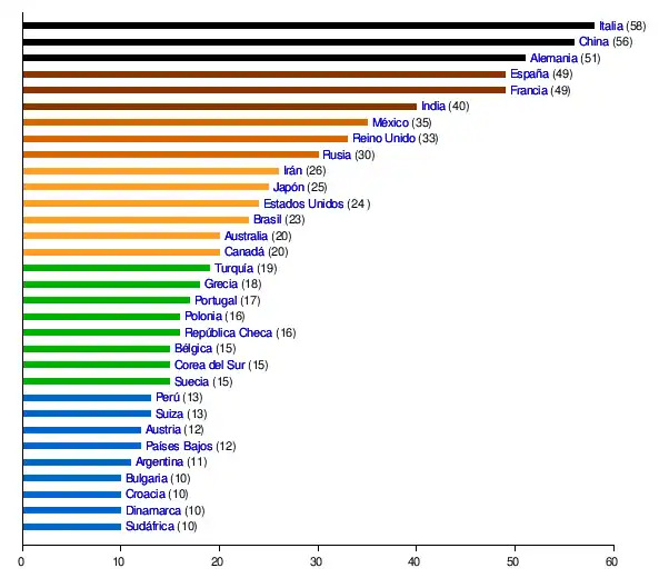 - Naranja: Países con 20 a 29 Patrimonios de la Humanidad