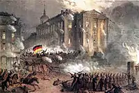 Después de los levantamientos populares en el sudoeste de Alemania, la revolución finalmente llegó a Berlín el 18 de marzo de 1848. Federico Guillermo IV tuvo noticias de los acontecimientos revolucionarios en Austria, anunció su disposición a convocar un parlamento nacional, pero en los combates de los soldados y la multitud berlinesa, los primeros malinterpretaron las órdenes del rey de no disparar y estalló la lucha. Al no saber cómo resolver la situación, el rey trató de evitar una guerra civil ordenando la retirada de las tropas. La Dieta Unida se reunió una vez más para resolver la convocatoria de una Asamblea Nacional Prusiana. Al mismo tiempo que se reunía la asamblea prusiana, se llevó a cabo la Asamblea Nacional Alemana, que se iba a reunir en Fráncfort del Meno.