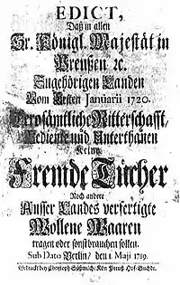 En la política comercial, Federico el Grande promovió especialmente la industria de la seda. Para ello, numerosos fabricantes, trabajadores cualificados y especialistas fueron llevados a Prusia y capacitaron a los trabajadores domésticos y asistentes. Con los productos manufacturados y de artesanía fabricados en el país, casi toda la demanda interna estaba satisfecha y se obtienen también una de las principales exportaciones, proporcionando así las importaciones de materias primas necesarias, que podrían ser fiscalmente más que compensadas. La balanza comercial que en 1740 aún tenía medio millón de ducados en déficit, pasó en 1786 a tres millones de ducados en exceso. Con su sucesor, Federico Guillermo II el único avance fue que se rompieron algunas de las barreras proteccionistas y prohibiciones.