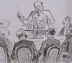 La Conferencia de Berlín de 1884, que reguló la colonización y el comercio europeos en África, suele considerarse el punto de partida de la repartición de África.[3] En el último cuarto del siglo XIX existían considerables rivalidades políticas y económicas entre los imperios europeos. El reparto de África se llevó a cabo en gran medida sin que los europeos entraran en guerra.[4] En los últimos años del siglo XIX, las naciones europeas pasaron del "imperialismo informal" -es decir, el ejercicio de la influencia militar y el dominio económico- al dominio directo, dando lugar al imperialismo colonial.[5]
