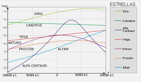 (a. C./d. C.)Sirio Canopus Vega Arturo Proción Altair α Cen −100000 −0,66 −0,82 +0,33 +0,88 +0,88 +1,69 +2,27 −75000 −0,86 −0,80 +0,24 +0,58 +0,73 +1,49 +1,84 −50000 −1,06 −0,77 +0,17 +0,30 +0,58 +1,27 +1,30 −25000 −1,22 −0,75 +0,08 +0,08 +0,46 +1,03 +0,63 0 −1,43 −0,72 0,00 −0,02 +0,37 +0,78 −0,21 25000 −1,58 −0,69 −0,08 +0,02 +0,33 +0,49 −0,90 50000 −1,66 −0,67 −0,16 +0,19 +0,32 +0,22 −0,56 75000 −1,66 −0,65 −0,25 +0,45 +0,37 −0,06 +0,30 100000 −1,61 −0,62 −0,32 +0,74 +0,46 −0,31 +1,05