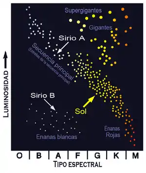 La componente primaria de las dos estrellas que conforman el sistema, Sirio A, es una estrella blanca de la secuencia principal de tipo espectral A1V que cuenta con una temperatura superficial de 9726 °C (10 000 K) y que está alejada a unos 8,6 años luz del sistema solar, lo que la convierte en la séptima estrella más cercana respecto al Sol. Su magnitud aparente en la banda B (azul) es –1,46, y en la banda V es –1,47.[1] Friedrich Bessel, en 1844, dedujo la presencia de una compañera, un objeto celeste muy tenue ahora llamado Sirio B o «el Cachorro», que fue observado casualmente por primera vez en 1862 por el constructor de objetivos astronómicos Alvan Graham Clark. Fue una de las primeras enanas blancas en ser descubiertas, su magnitud en la banda V es 8,44, su tipo espectral es DA2 y su temperatura superficial es de unos 25 200 K.[5]