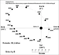 - Dos ciclos completos de 50,09 años a continuación del periastro de 1894,13 dan como resultado la fecha de 1994,31. Nótese que los decimales no indican días ni meses sino una fracción del año.