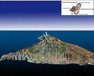 Finalmente, ya en tiempos más próximos (200 000 años), comienzan las erupciones que levantarían el Edificio Pico Viejo-Teide en el centro de la isla, sobre la Caldera de Las Cañadas.[46]