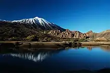 El pico del Teide, con 3718 metros sobre el nivel del mar y más de 7000 sobre el fondo oceánico, es el punto más elevado de la isla, del territorio español y de todas las tierras emergidas del Atlántico. Este volcán, el tercero más grande del planeta desde su base,[50] es el símbolo de Tenerife por antonomasia y el monumento natural más emblemático del archipiélago canario.[51] Su situación central, sus importantes dimensiones, su silueta y su paisaje nevado lo dotan de una singular personalidad. Ya los aborígenes guanches lo consideraban lugar de culto y adoración.