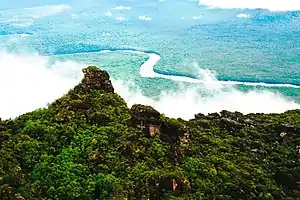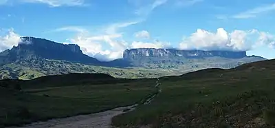 En Venezuela, donde la abundancia de estas formas es mayor, existen alrededor de 115 tepuyes en la Gran Sabana del sureste, en el borde con el Territorio Esequibo y Brasil. En Venezuela, el más conocido es el Auyantepui, el mayor de todos ellos —con 700 km² y un pico de casi 3000 m—, de cuya cima se precipita la cascada más alta del mundo, el Salto Ángel. Alcanzó fama internacional en 1935 cuando la gran cascada fue dada a conocer por el piloto estadounidense Jimmy Angel —aunque había sido descubierta anteriormente por Félix Cardona Puig—, que dos años más tarde se estrelló con su avioneta en la cima, el Roraima.[5]