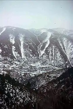 - Cuenca de recepción (erosión), donde se recogen las aguas durante las lluvias. En la imagen que muestra las partes de un pequeño torrente en los Pirineos puede verse con su forma de un embudo en la parte superior de la ladera. Dicho torrente está orientado hacia el norte, por lo que la imagen está dirigida hacia el sur, es decir, hacia las laderas de umbría (que reciben menos sol) quedando la parte con más nieve a un lado lo cual se puede deber a la procedencia del viento durante la tormenta que originó dicha acumulación: por lo general, la mayor cantidad de nieve se acumula en las laderas de barlovento, mientras que en las de sotavento, la nieve dura menos tiempo. Sin embargo, es justo señalar que esta idea no siempre se cumple, ya que si se trata de un viento seco y cálido (viento foehn), como sucede muchas veces en algunos valles de los Pirineos, puede hacer desaparecer la nieve en la ladera más expuesta a dicho viento. También es importante la incidencia de los rayos solares (vertientes de solana y umbría, porque los rayos solares explican aún más, la diferente cantidad de nieve en las dos laderas: como es una foto dirigida hacia el sur, el oeste queda hacia la derecha y la nieve se acumula en este lado porque inciden los rayos solares con menor intensidad durante la tarde por la sombra de la montaña y por la mayor nubosidad al final del día.