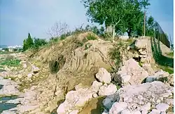 - Cono de deyección o abanico aluvial (sedimentación), donde se acumulan los sedimentos (bloques, cantos rodados, grava, arena) arrastrados por las aguas del torrente durante las crecidas, que se acumulan en forma de abanico al llegar a zonas de menor pendiente, generalmente, en el fondo del valle principal. Puede intuirse el cambio brusco de pendiente en el comienzo del cono de deyección.