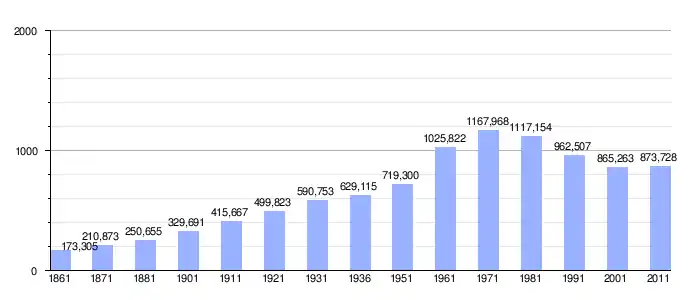 | Gráfica de evolución demográfica de Turín entre 1861 y 2011 |