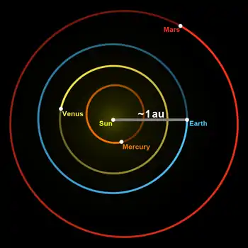 La unidad astronómica (abreviada ua, au, UA o AU) es una unidad de longitud igual, por definición, a 149 597 870 700 m,[1] que equivale aproximadamente a la distancia media entre la Tierra y el Sol. Esta definición está en vigor desde la asamblea general de la Unión Astronómica Internacional (UAI) del 31 de agosto de 2012, en la cual se dejó sin efecto la definición «gaussiana» usada desde 1976, que era «el radio de una órbita circular newtoniana y libre de perturbaciones alrededor del Sol descrita por una partícula de masa infinitesimal que se desplaza en promedio a 0,01720209895 radianes por día».[2]