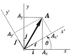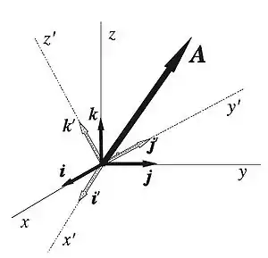 Ahora, supongamos que giramos el sistema de ejes coordenados, manteniendo fijo el origen del mismo, de modo que obtengamos un nuevo triedro ortogonal de ejes (x′, y′, z′), con una base vectorial asociada definida por los versores . Los componentes del vector en esta nueva base vectorial serán: