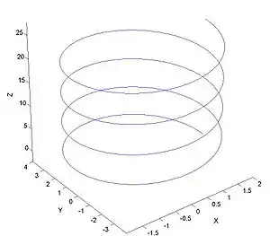Esta función representa una curva helicoidal alrededor del eje z, de radio unidad, como se ilustra en la figura. Podemos imaginar que esta curva es la trayectoria de una partícula y la función representa el vector posición en función del tiempo t. Derivando tendremos: